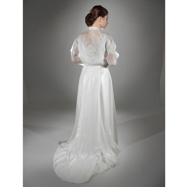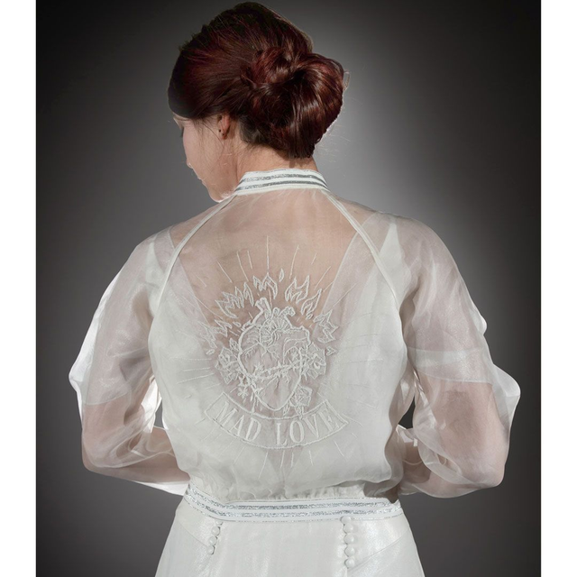 Blouson en organza de soie blanc cassé, motif MAD LOVE brodé à la main au dos. Une pièce ultra féminine et rock & roll à la fois pour habiller votre robe de mariée.