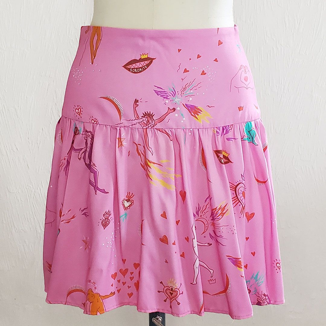 Jupe courte rose avec l’imprimé Dancing Queens, imprimé unique car dessiné par Atelier Juliette H. Zippée au milieu dos.