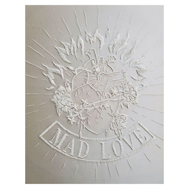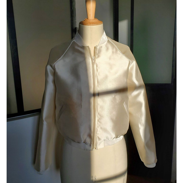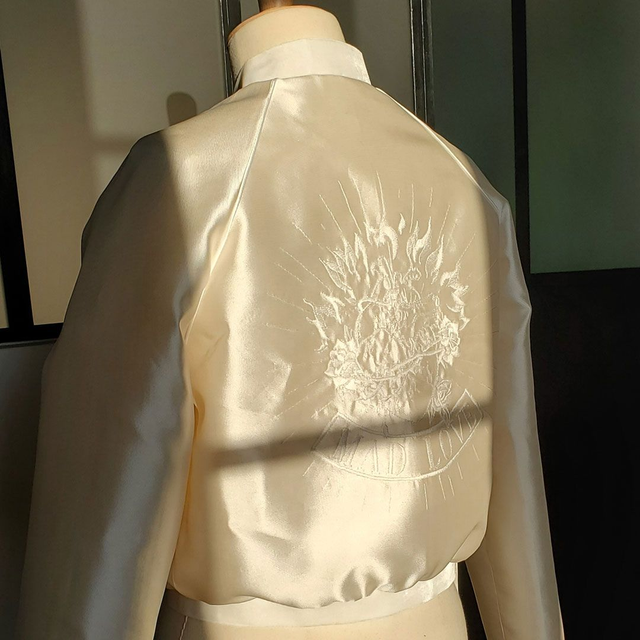 Blouson de mariée, motif MAD LOVE brodé à la main au dos en faille de soie ivoire. Une pièce ultra féminine et rock & roll à la fois pour habiller votre robe de mariée.