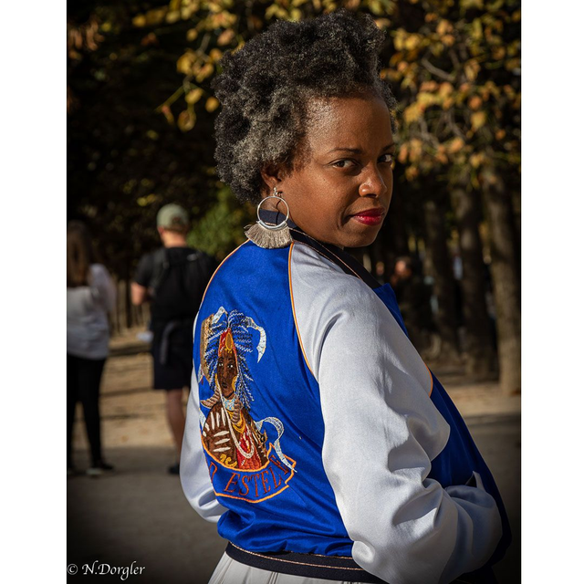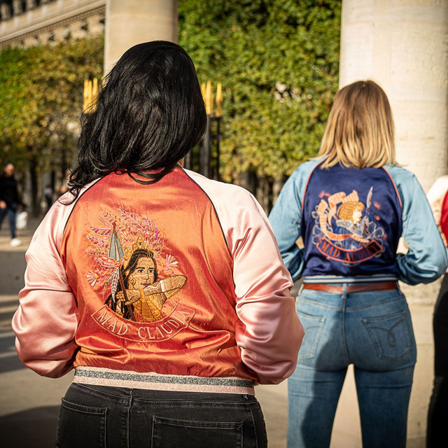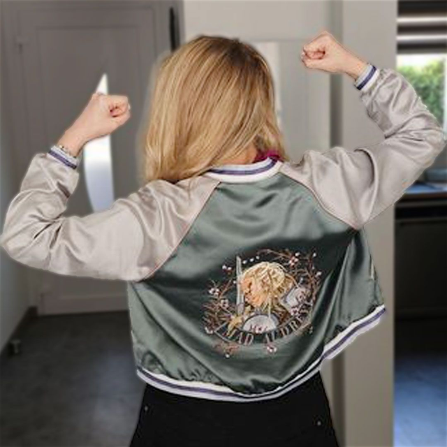 Blouson personnalisé, avec votre portrait en guerrière brodé à la main au dos.