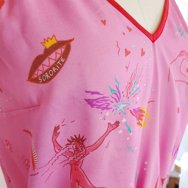 Débardeur rose avec l’imprimé Dancing Queens, imprimé unique car dessiné par Atelier Juliette H. Bretelles réglables, contrastées rouges.